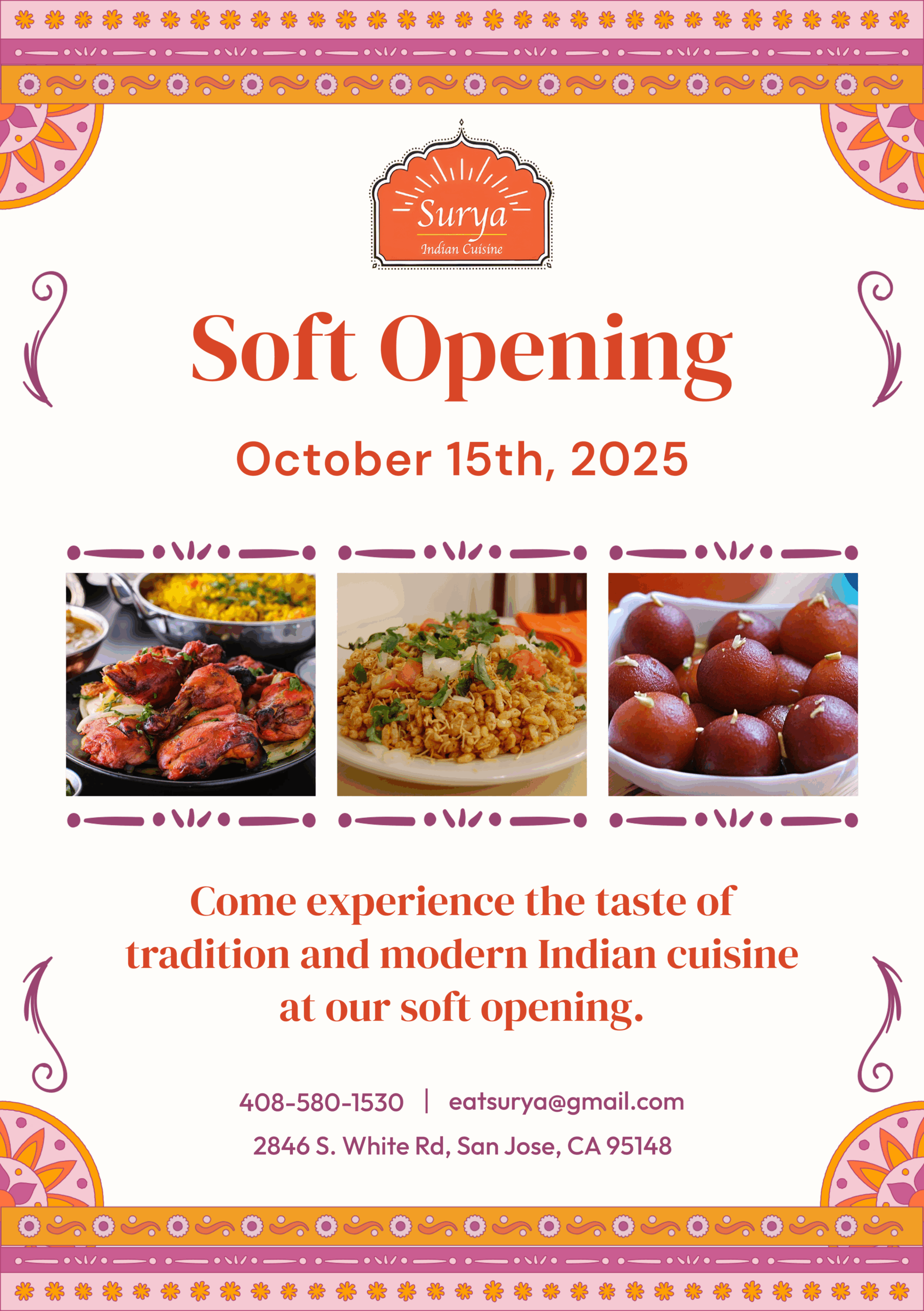 Bring the bold and authentic flavors of India to your next event. Our catering services are perfect for weddings, parties, and corporate gatherings. Choose from a wide variety of dishes, customized to suit your guests' tastes. Let Surya Indian Cuisine make your celebration truly unforgettable.